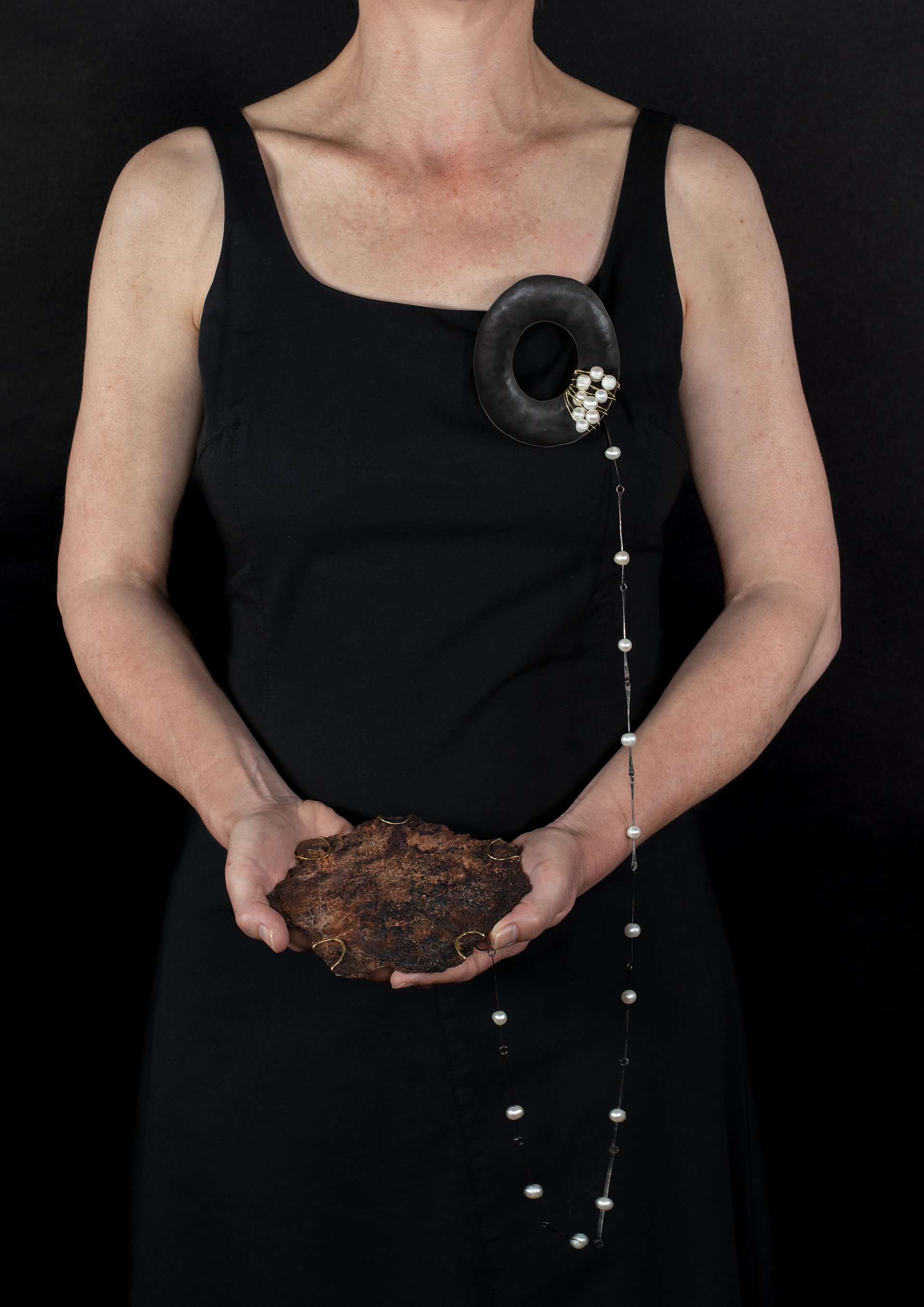 Iron (rust), oxidised copper, brass, freshwater pearls, silk